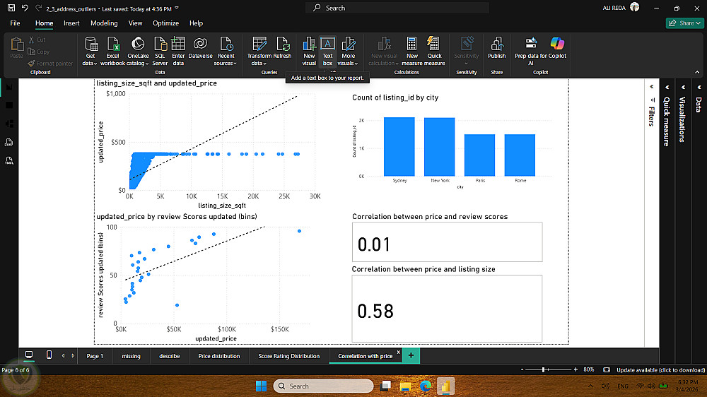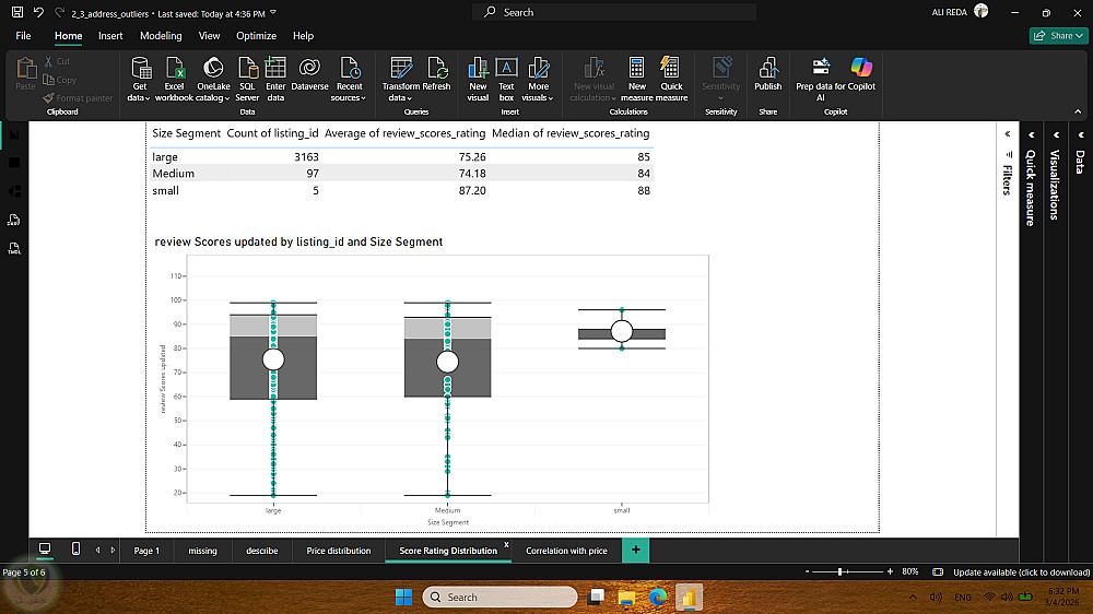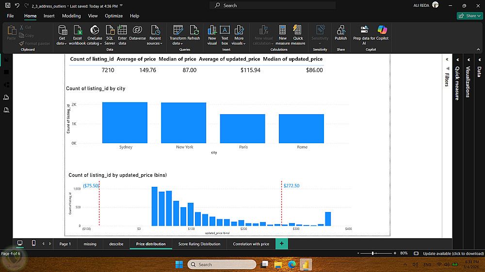 ركز التحليل على استكشاف توزيع الأسعار، أنواع العقارات، والمناطق الأكثر طلبًا، بالإضافة إلى دراسة العوامل التي تؤثر على سعر الإيجار مثل الموقع، عدد الغرف، التقييمات، وتوفر الخدمات. كما قمت بتحليل أنماط الحجوزات وتحديد المدن أو الأحياء التي تحقق أعلى عائد.