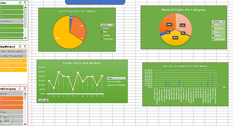 تشمل التحليلات: مقارنة إجمالي المبيعات بين الفئات، متابعة عدد الطلبات، تحليل الاتجاه الشهري، ودراسة متوسط الضرائب على المنتجات. تم استخدام Pivot Tables وPivot Charts مع Slicers لتمكين التفاعل وتصفية البيانات بسهولة.