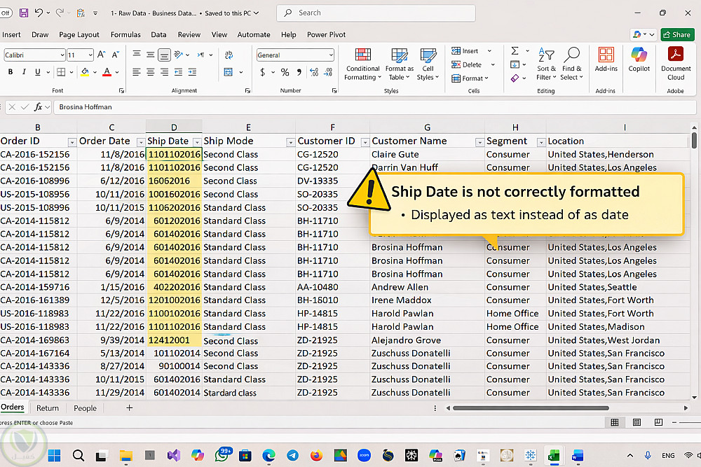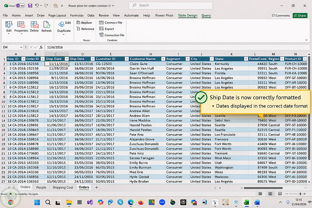 - تعديل تنسيق الأعمدة لتنسيق صحيح كـ Ship Date
