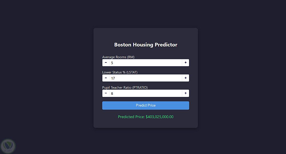 مشروع متكامل من البداية إلى النهاية يعتمد على نموذج تعلم آلي مدرَّب على مجموعة بيانات "اسعار المنازل في بوسطن" لتوقع أسعار المنازل. يأخذ النموذج ثلاثة مدخلات عدد الغرف، ونسبة السكان الأقل دخلاً، ونسبة الطلاب إلى المعلمين ثم يعرض السعر المتوقع فورًا عبر واجهة ويب تفاعلية مبنية باستخدام الداش. يشمل المشروع مرحلة التحليل الاستكشافي للبيانات، وتدريب النموذج، ثم نشره كتطبيق ويب