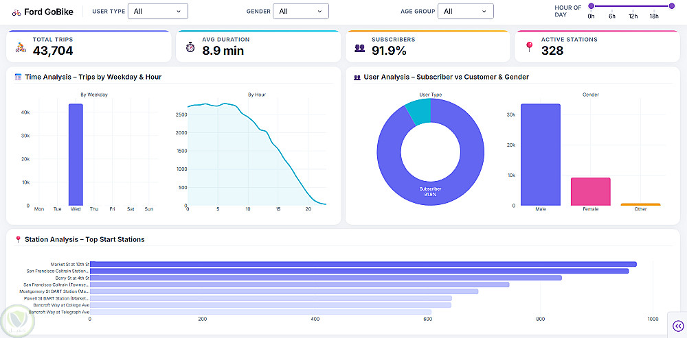 مشروع جماعي متكامل يحلل بيانات رحلات دراجات فورد جوبايك لشهر فبراير 2019. يمر المشروع بثلاث مراحل: التحليل الاستكشافي للبيانات، ثم تنظيف البيانات وهندسة المتغيرات الجديدة كفئات العمر ومدة الرحلة بالدقائق، وأخيرًا لوحة تحكم ويب تفاعلية تعرض مؤشرات أداء رئيسية (إجمالي الرحلات، متوسط المدة، عدد المشتركين، المحطات النشطة)، وتحليلًا زمنيًا حسب الأيام والساعات، وتحليلًا لسلوك المستخدمين وأكثر المحطات استخدامًا.