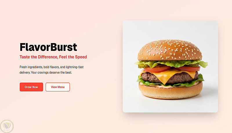 قمت بتصميم صفحة هبوط جذابة لمطعم برجر باسم FlavorBurst بأسلوب حديث يركز على إبراز المنتج بشكل بصري قوي.