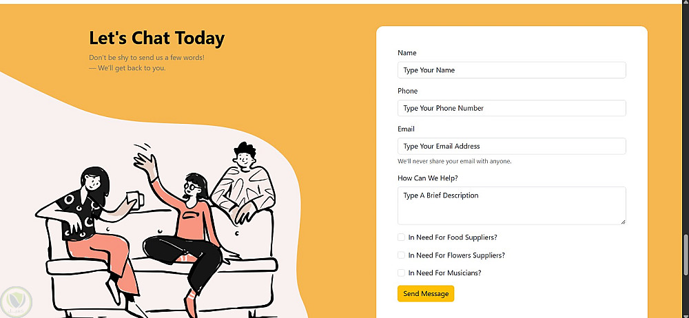 نموذج تواصل ذكي : نظام لاستقبال طلبات العملاء مع إمكانية تحديد نوع الخدمة المطلوبة (موردين طعام، زهور، موسيقيين).