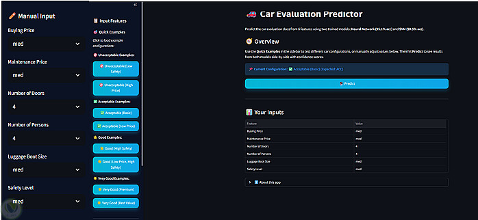 تم تطوير نموذج Machine Learning للتنبؤ بمدى قبول السيارات باستخدام UCI Car Evaluation Dataset. يقارن المشروع بين نموذج Multilayer Perceptron (MLP) وهو Neural Network ونموذج Support Vector Machine (SVM) من أجل Multi-class Classification. بعد تطبيق Ordinal Encoding ومعالجة Class Imbalance، حقق نموذج MLP دقة بلغت 95% Accuracy متفوقًا على نموذج SVM الأساسي.