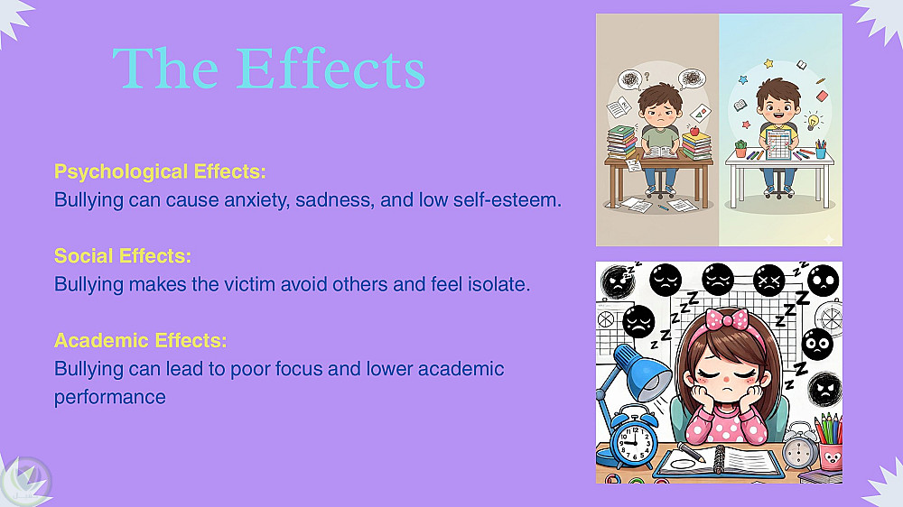 تضمن العرض شرحًا مبسطًا لمفهوم التنمر، وأنواعه المختلفة مثل التنمر الجسدي واللفظي والإلكتروني، بالإضافة إلى توضيح أسبابه ونتائجه النفسية والاجتماعية. كما اشتمل على أمثلة واقعية وحلول عملية للحد من هذه الظاهرة، مع تقديم نصائح للتعامل معها سواء للضحايا أو المحيطين بهم.