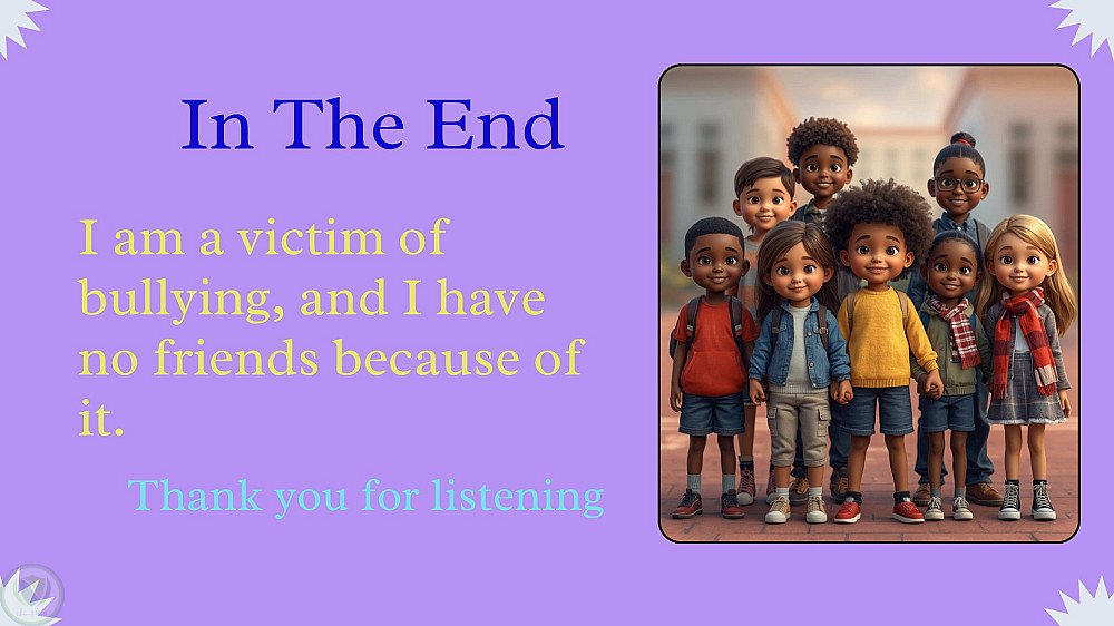 قمت بإعداد عرض تقديمي (Presentation) متكامل حول موضوع "التنمر"، وذلك بناءً على طلب خاص، بهدف التوعية بالمشكلة وتسليط الضوء على آثارها السلبية على الأفراد والمجتمع.