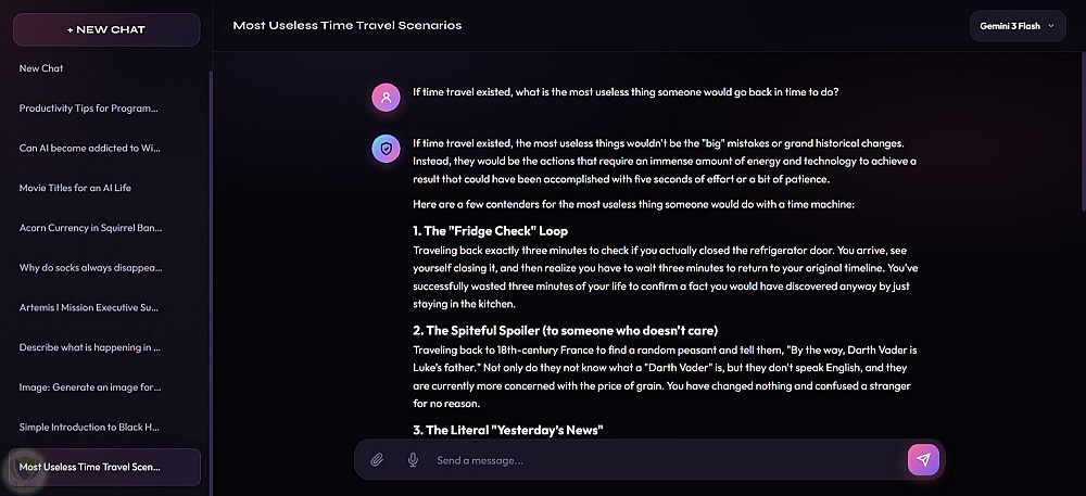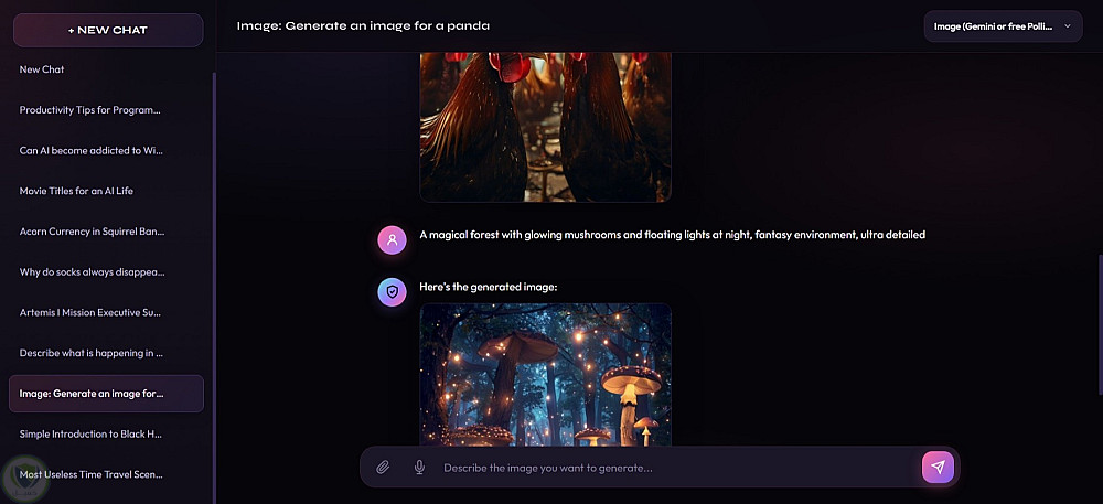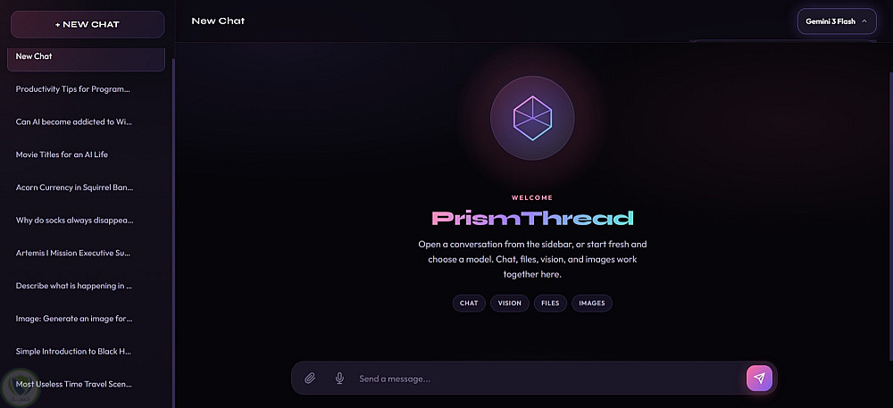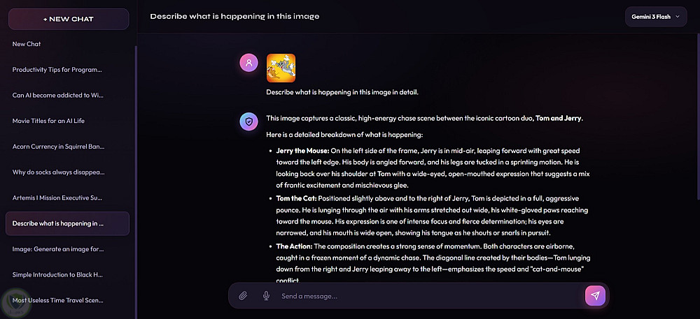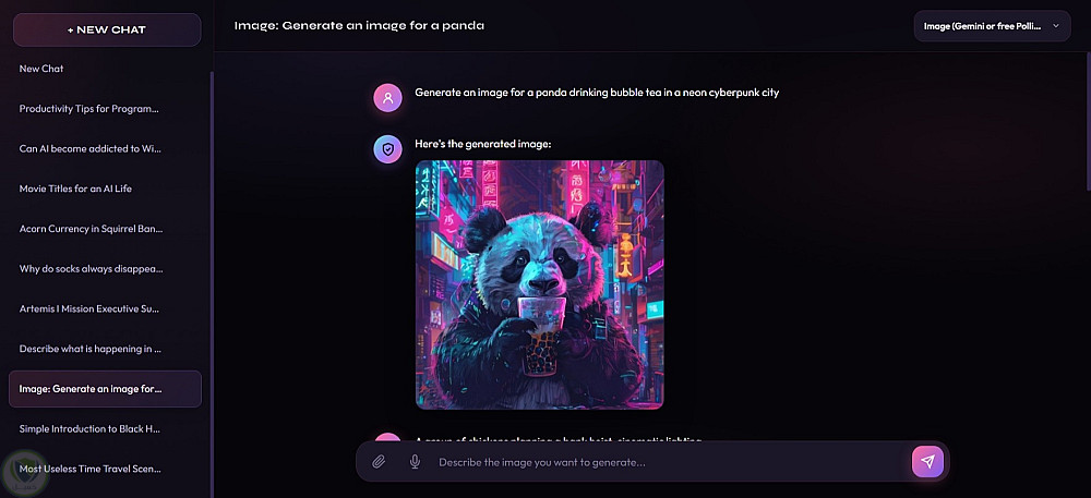 تطبيق ويب كامل (Full-Stack) يحاكي تجربة مساعد محادثة حديث. يتيح للمستخدم اختيار نموذج ذكاء اصطناعي من عدة مزودين مثل Google Gemini وGroq وOpenRouter، وإرسال نصوص وملفات وصور مع حفظ المحادثات في قاعدة بيانات. يدعم تحليل الصور عبر Gemini، وتوليد الصور من الوصف (مع احتياطي مجاني عبر Pollinations)، والتفريغ الصوتي من الميكروفون إلى نص باستخدام Groq، بالإضافة إلى قراءة ردود المساعد صوتيًا عبر المتصفح.