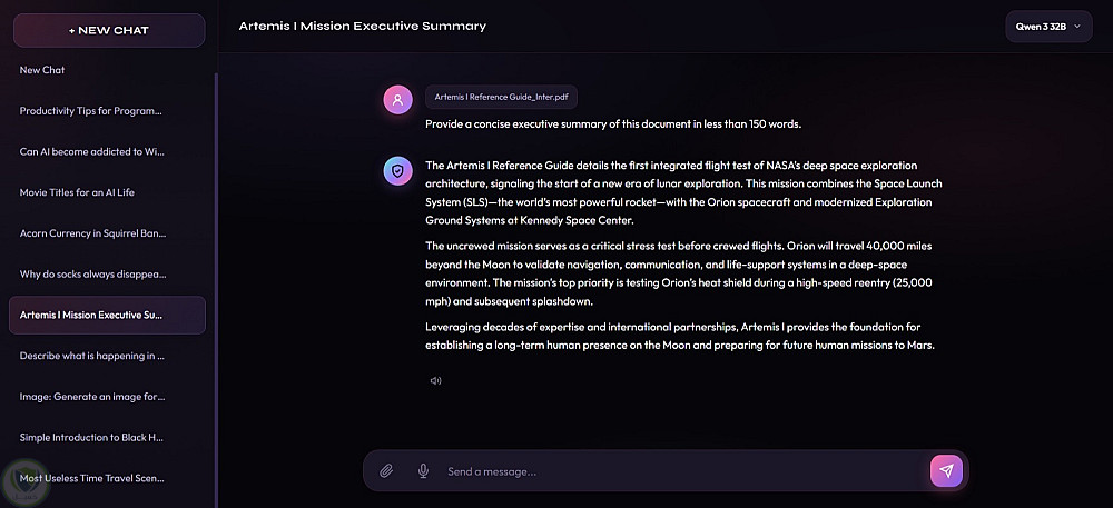 الخادم مبني باستخدام Node.js وTypeScript وExpress.js مع MongoDB لإدارة المحادثات والرسائل، بينما الواجهة الأمامية مبنية باستخدام HTML وCSS وJavaScript مع دعم Markdown لعرض الرسائل. يوفر التطبيق ميزات مثل تعدد المحادثات، رفع المرفقات (صور وPDF وملفات نصية)، السحب والإفلات، عناوين تلقائية للمحادثات، وواجهة متجاوبة بتصميم حديث.