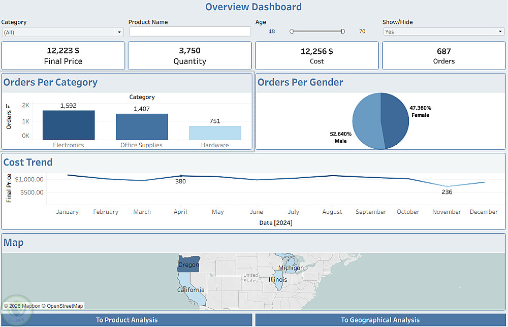 قمت بتصميم Dashboard تفاعلي باستخدام Tableau لتحليل بيانات المبيعات داخل الولايات المتحدة، بهدف استخراج مؤشرات الأداء الرئيسية (KPIs) وتسهيل اتخاذ القرار بناءً على البيانات.