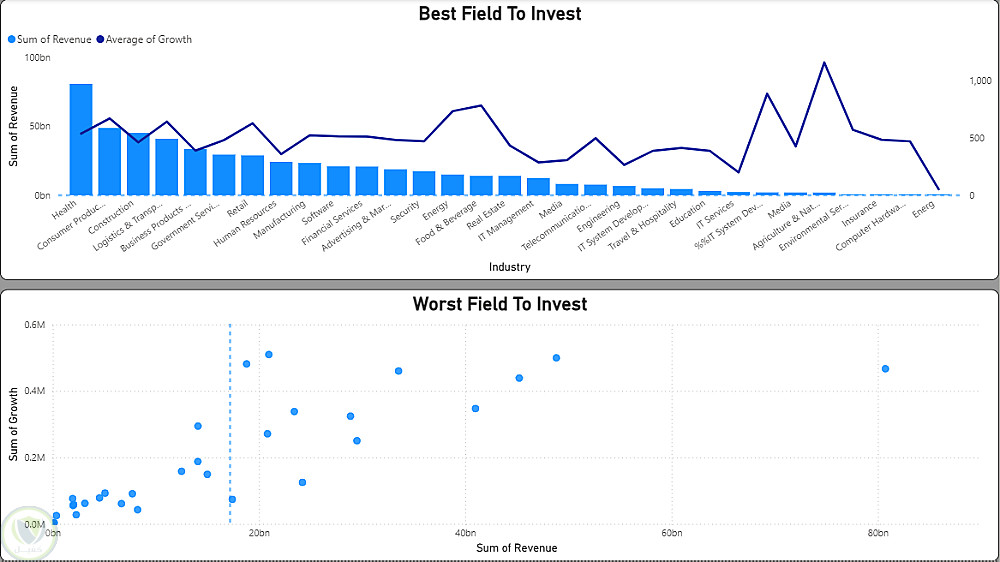 تحليل الاتجاهات الاستثمارية (Best/Worst Field to Invest): دمج مؤشرات الربحية (Sum of Revenue) مع معدلات النمو (Average of Growth) لتحديد القطاعات الواعدة (مثل قطاع الصحة Consumer Products).