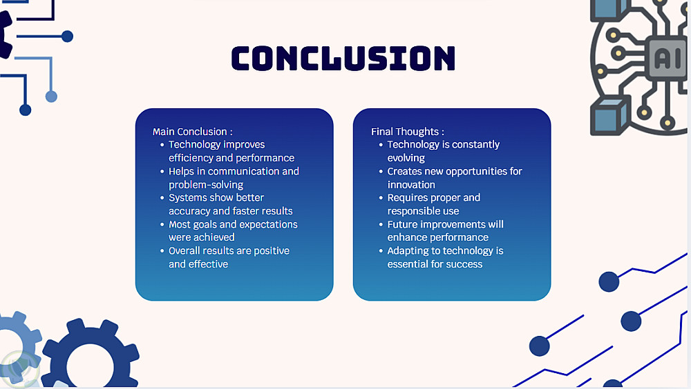 تم تصميم هذا النموذج على شكل عرض تقديمي يهدف إلى تبسيط مفهوم التكنولوجيا وشرح مكوناتها الأساسية بطريقة منظمة وواضحة. يعتمد النموذج على تقسيم المحتوى إلى أقسام رئيسية تشمل المقدمة، العملية، التحليل، النتائج، والاستنتاج، مما يساعد على فهم تسلسل الأفكار بشكل منطقي وسهل.