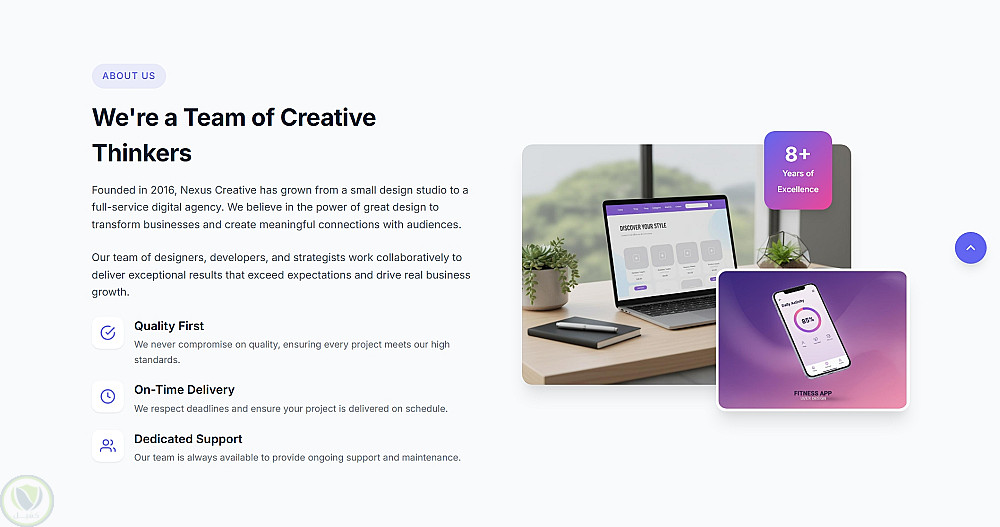 ألوان حديثة بتدرجات Purple/Indigo مع Pink Accent، تأثيرات Hover وFade-in Animations، خط Inter، تصميم Mobile-First متوافق مع جميع الأجهزة.