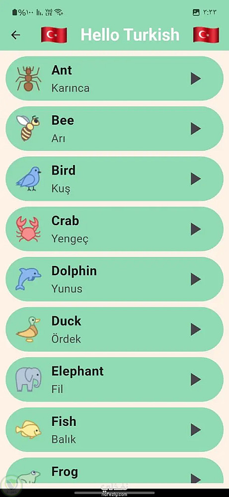 تطبيق ترجمة كلمات للأطفال (إنجليزي → تركي) مع صوت نطق الكلمات