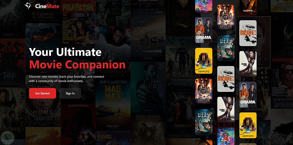 CineMate هي منصة رقمية عصرية مخصصة لعشاق السينما والأفلام، تتميز بتصميم واجهة مستخدم (UI) أنيق يعتمد على الوضع الليلي (Dark Mode) مع لمسات باللون الأحمر، مما يوفر تجربة مشاهدة وتصفح مريحة وجذابة.