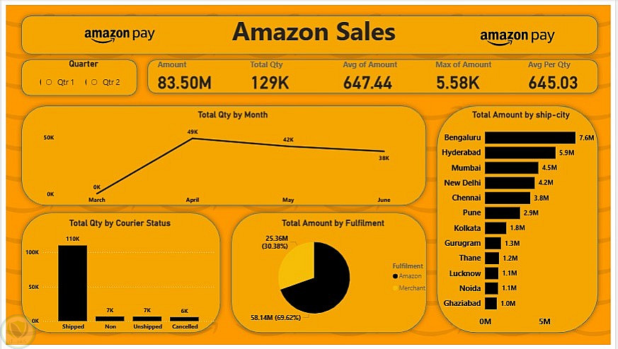 تحليل زمني وجغرافي: عرض المبيعات حسب الشهور، الأرباع السنوية (Quarters)، وتوزيع المبيعات حسب المدن (كما يظهر في نموذج Amazon Sales).