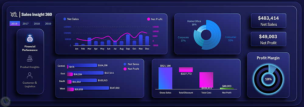 - الأداء المالي : تتبع صافي المبيعات والأرباح والاتجاه الزمني للتوزيع الجغرافي.