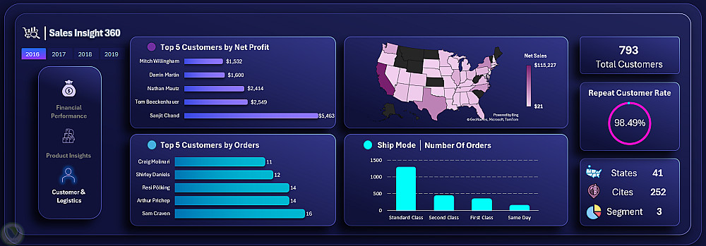 - العملاء واللوجستيات : خريطة جغرافية تفاعلية، وتتبع معدل احتفاظ العملاء وأفضلهم.
