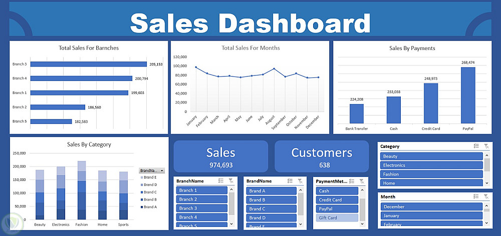* إنشاء رسومات بيانية لعرض المبيعات حسب الفروع، الشهور، وطرق الدفع