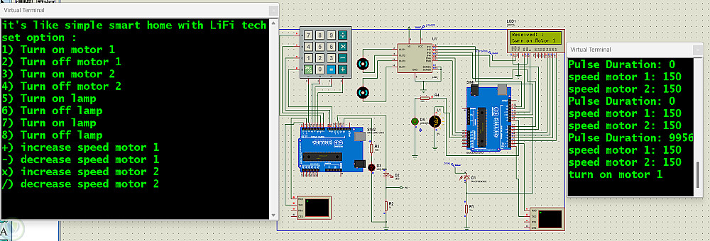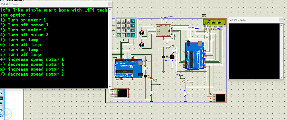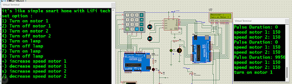 ظام اتصال باستخدام تقنية Li-Fi يعتمد على الضوء بدل الموجات الراديوية لنقل البيانات داخل نفس المكان. يتم إرسال البيانات عبر مصابيح LED بتغيير شدة الإضاءة بسرعة عالية، ويستقبلها حساس ضوئي يحولها إلى إشارات إلكترونية قابلة للمعالجة. يتيح النظام التحكم في أجهزة مثل المحركات والمصابيح (تشغيل/إيقاف وزيادة/تقليل السرعة) باستخدام أوامر محددة. يتميز بسرعة نقل عالية، أمان وخصوصية أكبر لعدم اختراق الضوء للجدران، واستهلاك منخفض للطاقة. مناسب لتطبيقات التحكم الذكي والأنظمة الآمنة داخل الغرف أو المنشآت المغلقة.