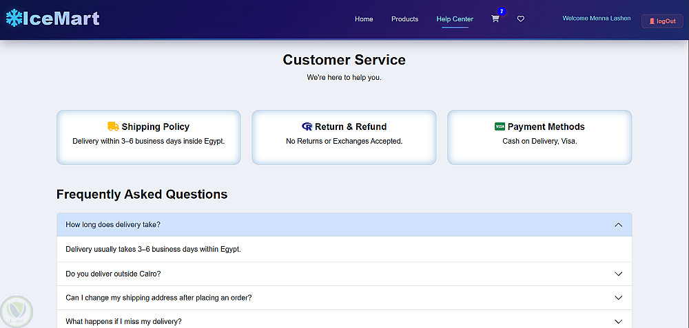 قمت بتطوير صفحة "خدمة العملاء" (Customer Service) لموقع ويب، بهدف توفير دعم سريع وسهل للمستخدمين من خلال عرض المعلومات الأساسية والأسئلة الشائعة بشكل منظم.