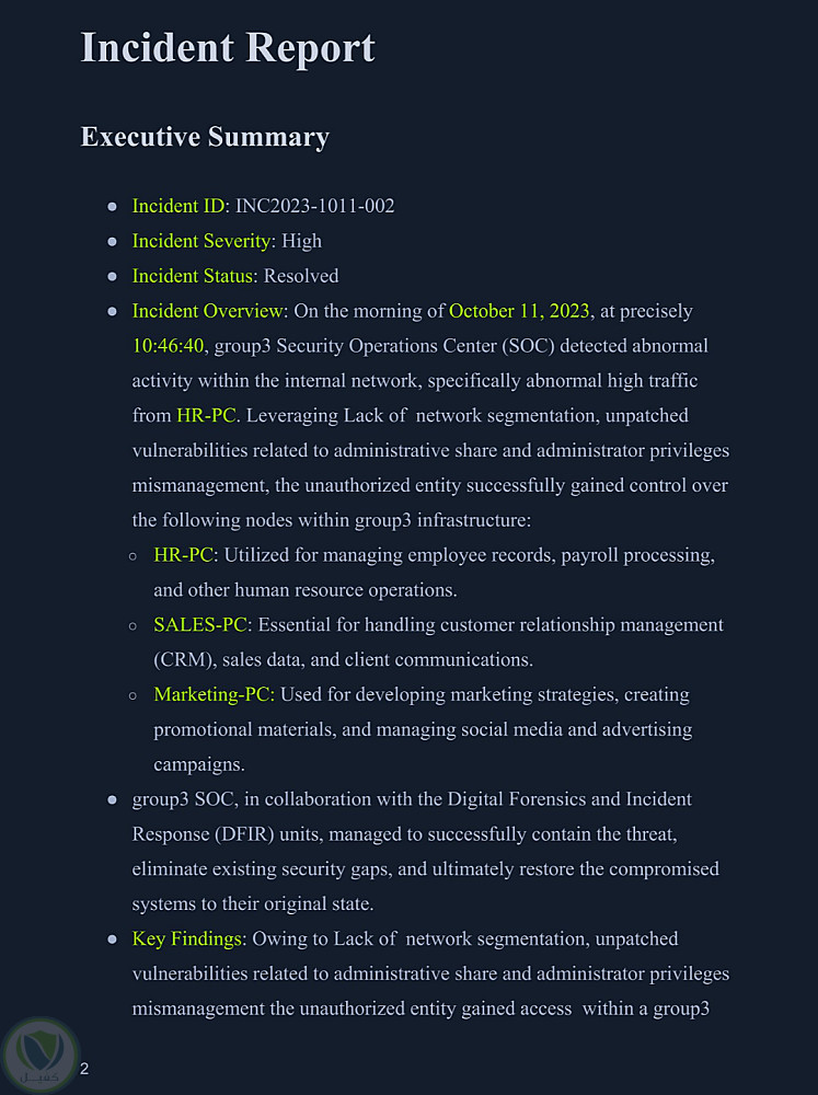 تم إعداد تقرير استجابة للحوادث يتضمن: