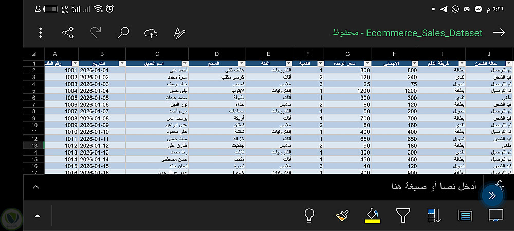 تنظيم وتفريغ بيانات مبيعات يومية لمتجر إلكتروني، يتضمن ترتيب الطلبات حسب التاريخ، اسم العميل، المنتج، وحالة الشحن، مع حساب الإجمالي لكل طلب لتسهيل عملية الجرد والمتابعة