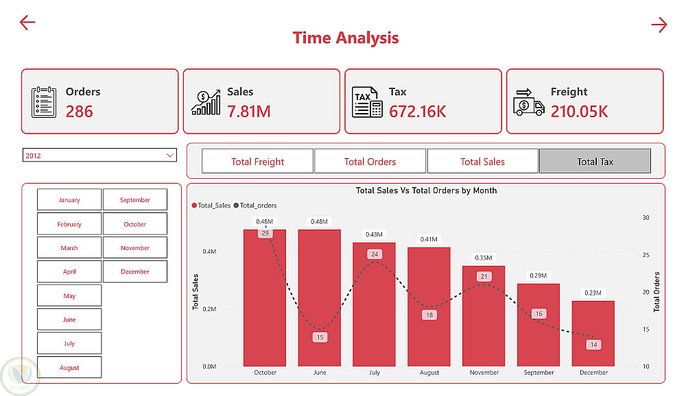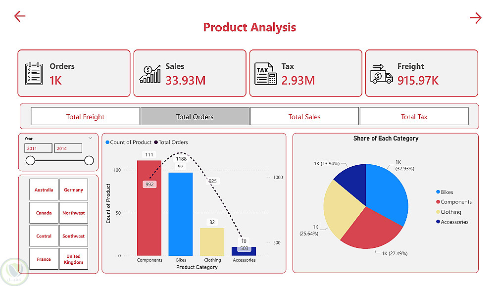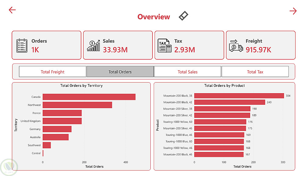 - ملخص تنفيذي (نظرة عامة): نظرة شاملة على إجمالي المبيعات (33.93 مليون دولار أمريكي)، وإجمالي الطلبات، ومؤشرات الضرائب والشحن.