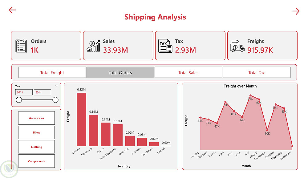 - الشحن والنقل: تتبع تكاليف الشحن الشهرية، مع تسليط الضوء على فترات الذروة الموسمية مثل شهر يوليو (96 ألف دولار أمريكي).
