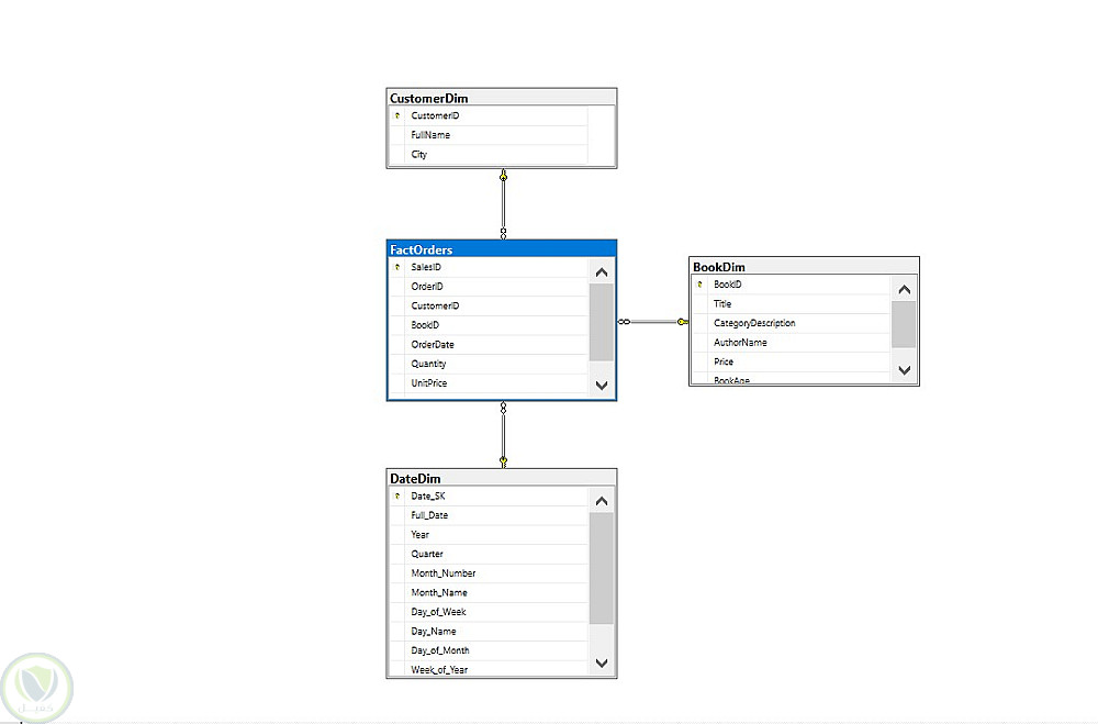 نمذجة البيانات: تحويل الجداول العلائقية إلى Star Schema تشمل جدول حقائق (FactOrders) وجداول أبعاد (Customer, Book, Date).