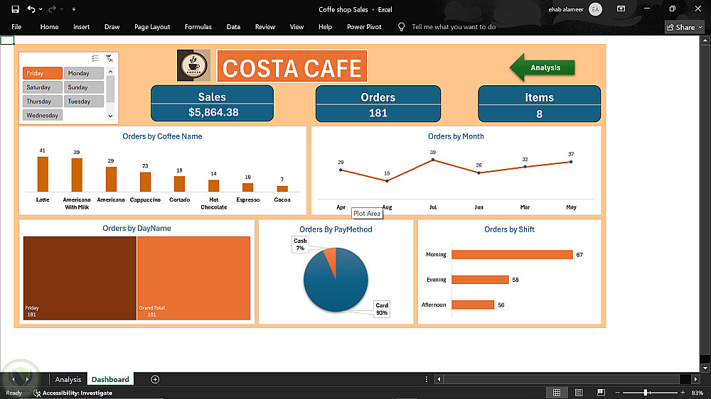 تصميم نظام تقارير تفاعلي لإدارة أداء كافيه احترافي - Excel.