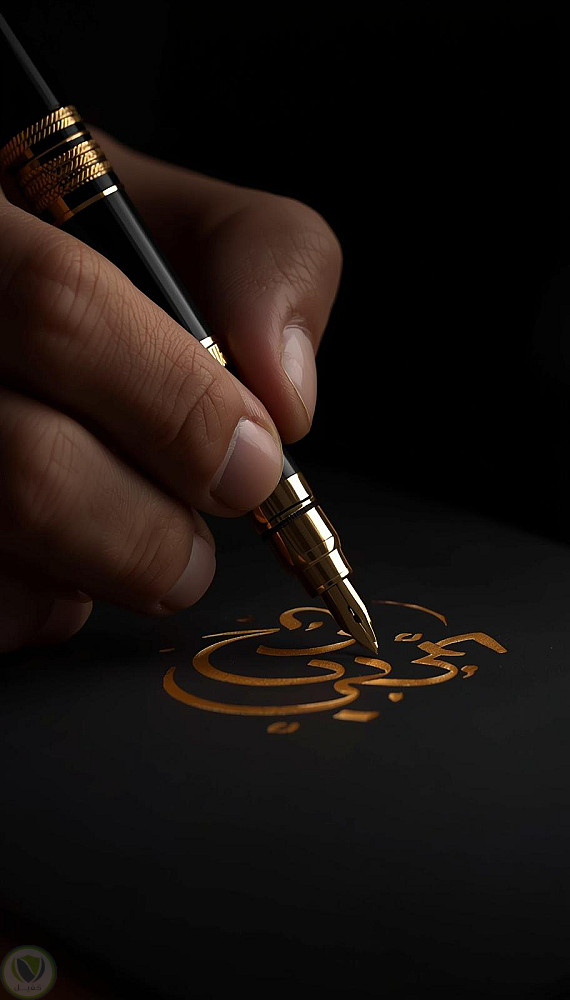 نموذج لتصميم لوجو احترافي بالخط العربي مع لمسة فاخرة باستخدام الحبر الذهبي على خلفية سوداء.