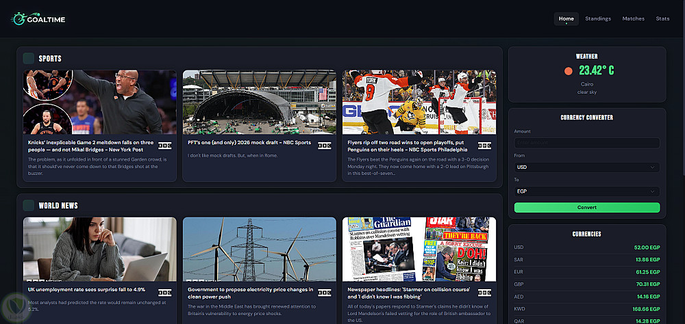 تتميز منصة GoalTime بتصميم عصري وسهل الاستخدام، مع تجربة تفاعلية تعتمد على تحديث البيانات بشكل لحظي، مما يجعلها مناسبة لمحبي متابعة كرة القدم والأخبار أولاً بأول.