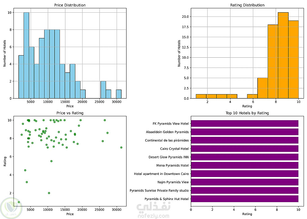 يدخل المستخدم رابط البحث واسم ملف CSV، ثم يقوم السكربت بتصفح الصفحات واستخراج: اسم الفندق، الموقع، السعر، التقييم، عدد المراجعات، والرابط. بعد ذلك يتم تنظيف البيانات وتحليلها وعرضها برسوم بيانية.