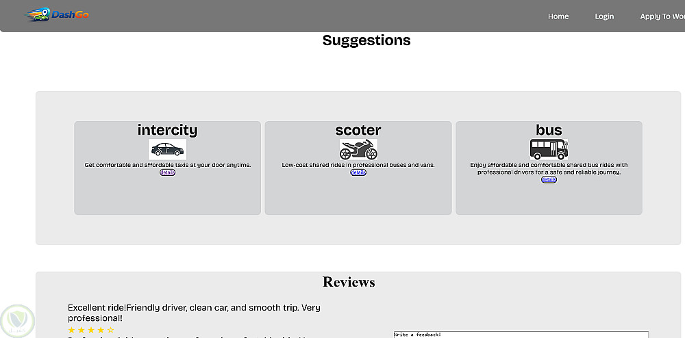قمت بإنشاء 3 صفحات داخل الموقع، تشمل عرض أنواع مختلفة من المواصلات، وصفحة للتسجيل، وصفحة رئيسية لعرض الخدمات بشكل منظم وبسيط.