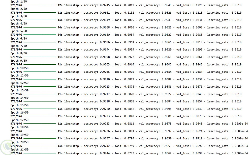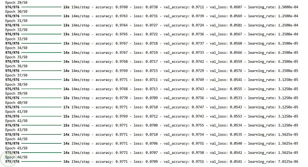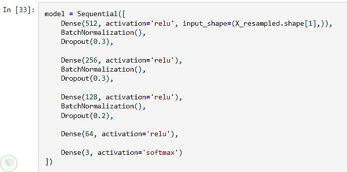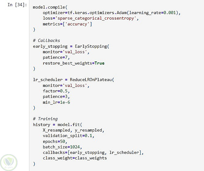 تم بناء النموذج باستخدام شبكة عصبية عبر TensorFlow وKeras مع تحسينات مثل Batch Normalization وDropout وEarly Stopping. حقق النظام دقة تصل إلى حوالي 97.5% على بيانات التحقق، مما يعكس كفاءته في التنبؤ.