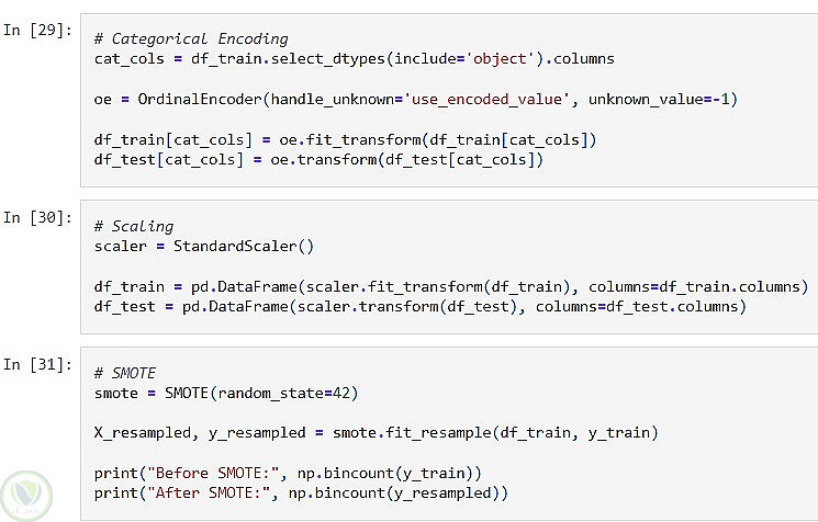 تم تطبيق خط معالجة بيانات متكامل يشمل ترميز البيانات الفئوية باستخدام Ordinal Encoding، وتوحيد القيم باستخدام StandardScaler، بالإضافة إلى معالجة عدم توازن البيانات باستخدام SMOTE لتحسين أداء النموذج.