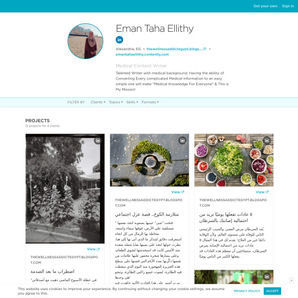 بحكم تخرجي من كلية الصيدلة وموهبتي في الكتابة، أقدم لكم بعض أعمالي في الكتابة الطبية؛ مقالات حصرية تحتوي معلومات طبية صحيحة باللغة العربية وبشكل شيق وميسر بعيد عن التعقيد.