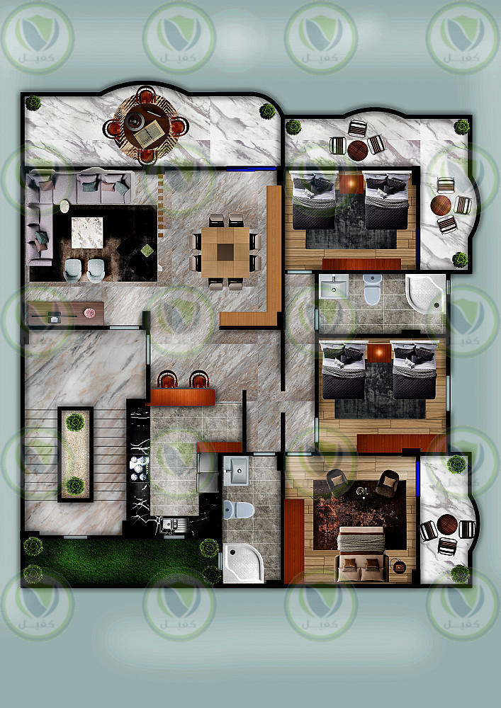 تصميم معماري وإظهار بالفرش لبيت عائلي