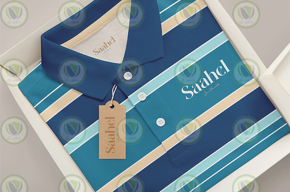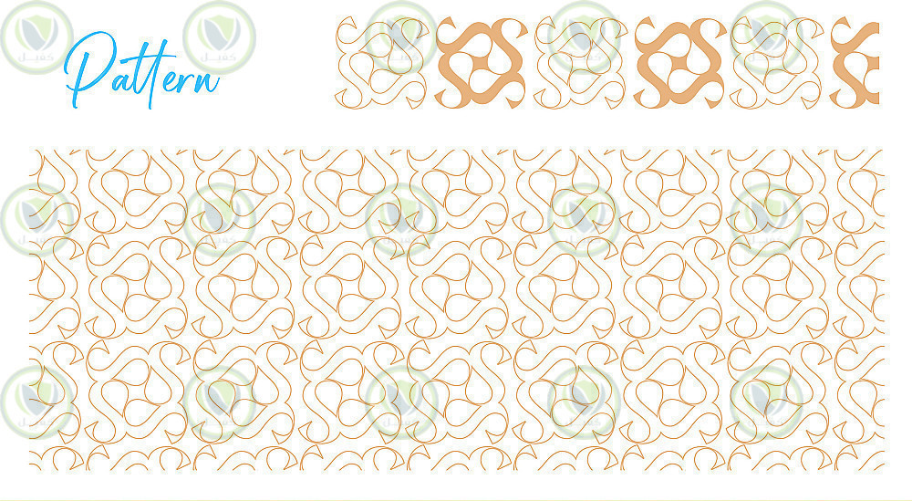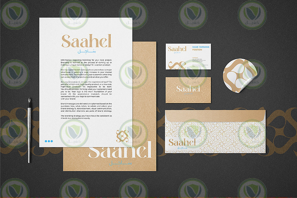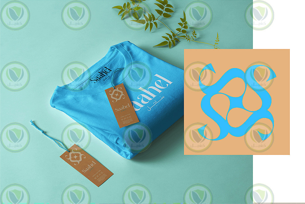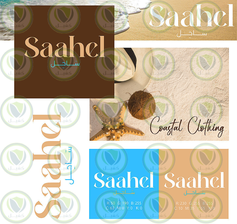 براند قطري لملابس ساحلية اختيار الالوان كانت الوان الرمال والشاطئ واستخدام الكلمة والحرف الأول منها في استخراج نمط فني متكرر