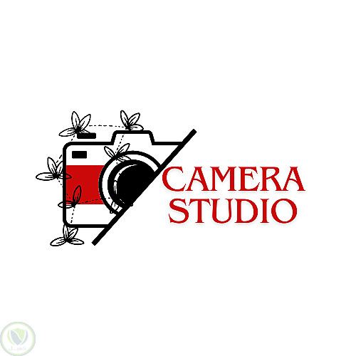 تصميم لوغو مميز بلونين أحمر وأسود بإسم CAMERA STUDIO أيقونة كاميرا احترافي