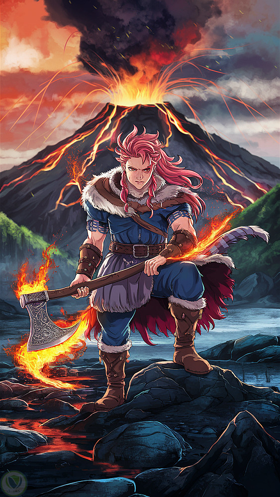 شخصية انمي فايكنغ قمت باختيار لون الشعر الأحمر لتدل على البراكين وتنفيذاً لطلب الزبون وقمت بوضع فأس تتحكم بالبراكين