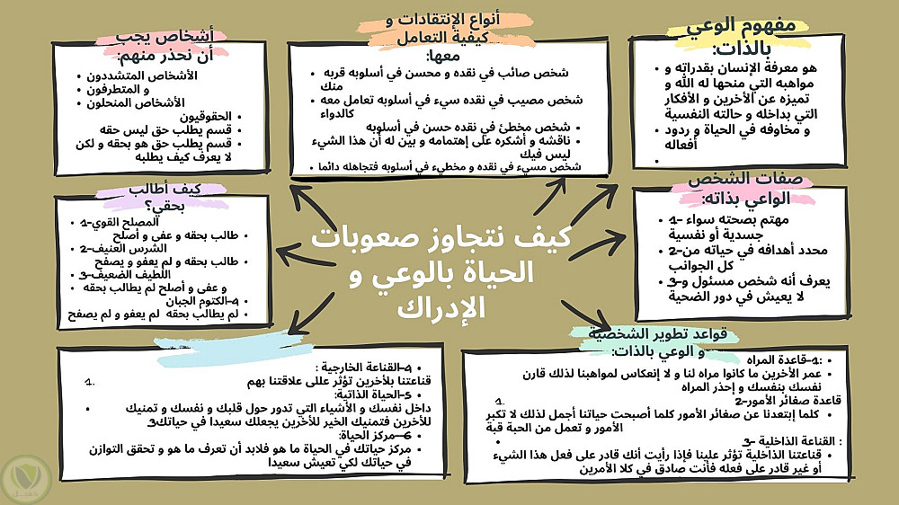 إنفوجرافيك لموضوع الوعي بالذات يتكون من ثمان أجزاء