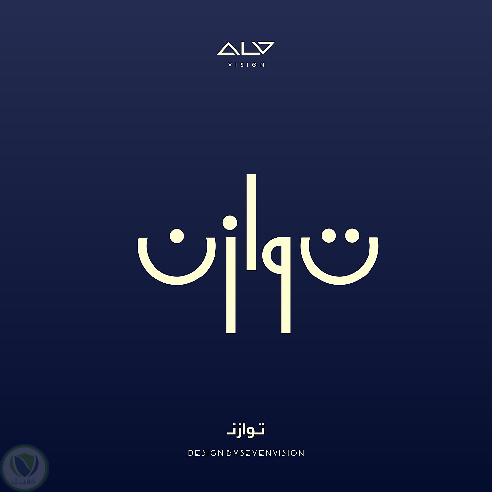 تصميم تايبو غرافي لكلمة "توازن" حيث تم تصميم الكلمة على شكل ميزان بالفوتوشوب