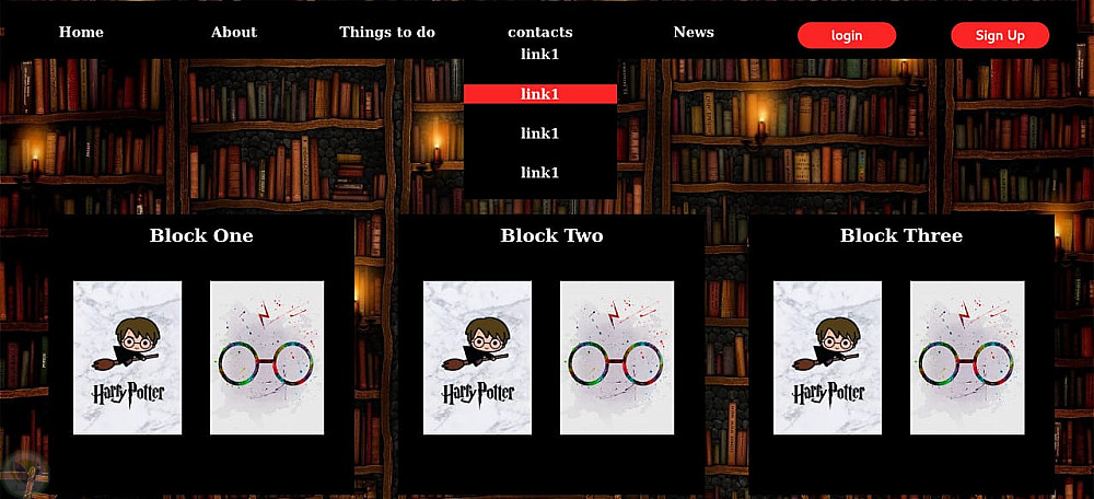 الكتلة الثانية: تعرض نفس الاسم "Hatty Potter" وتشمل خيارات إضافية مثل "News" و"Login" و"Sign Up".