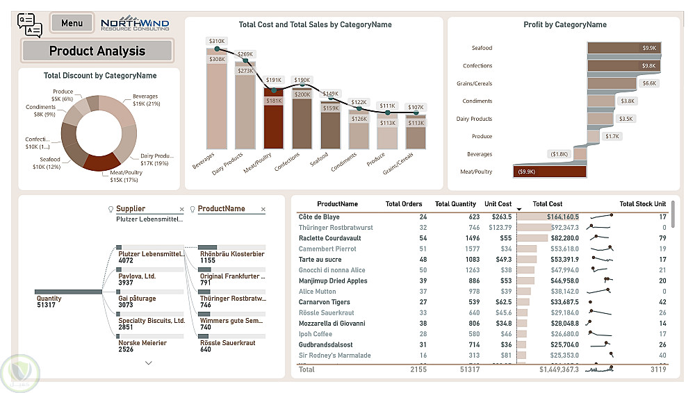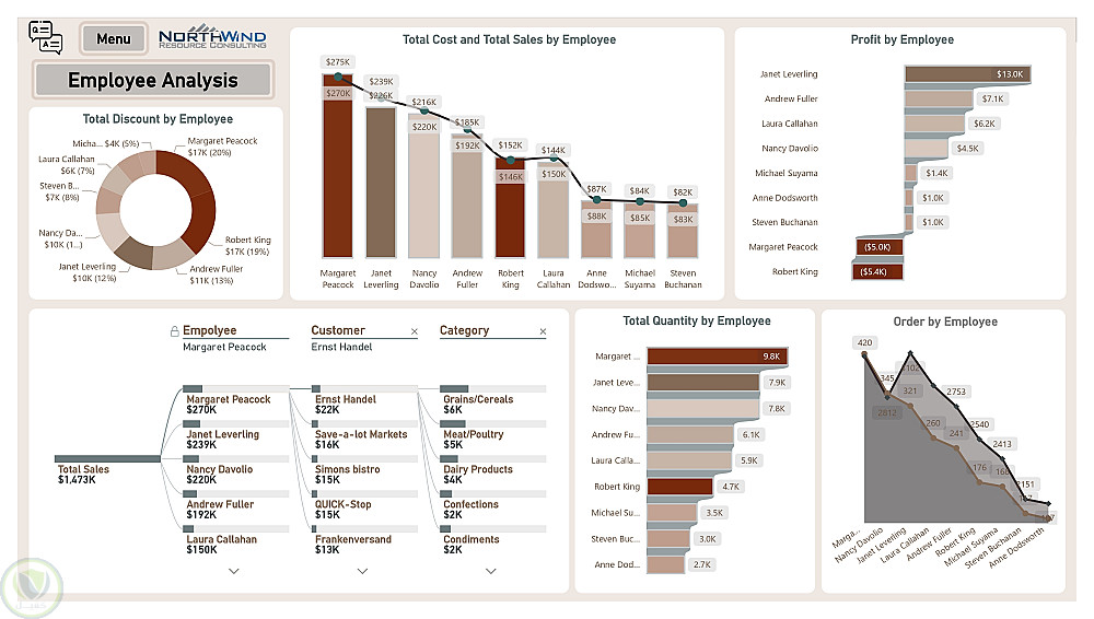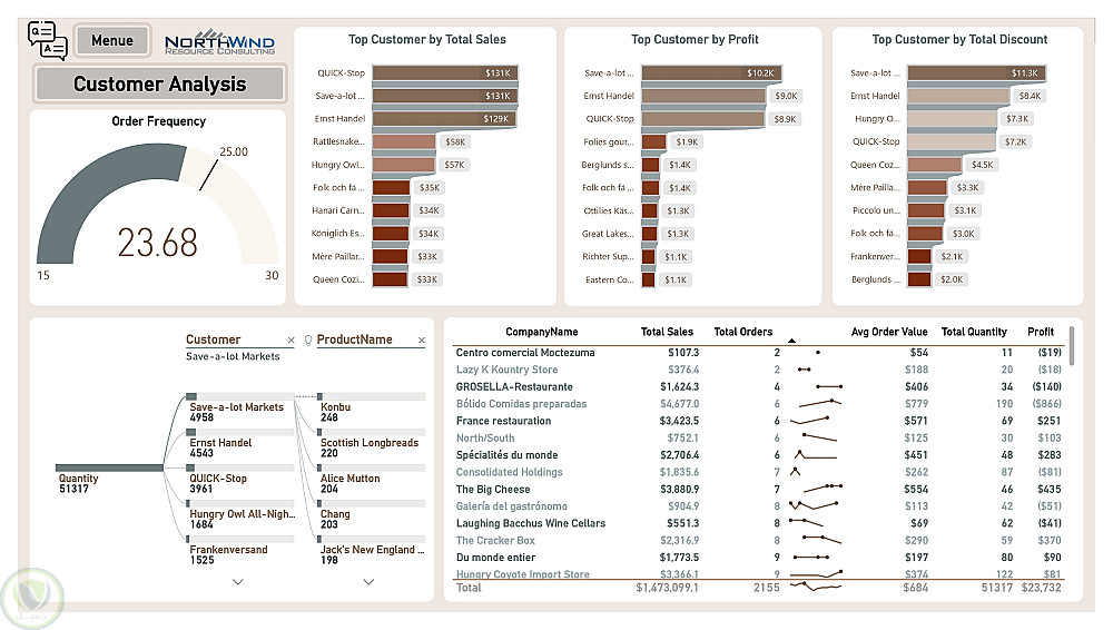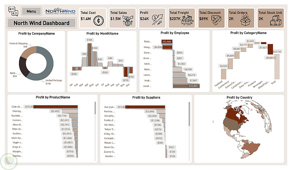 قمت بتنفيذ مشروع تحليل بيانات لشركة Northwind بإستخدام Power Bi.