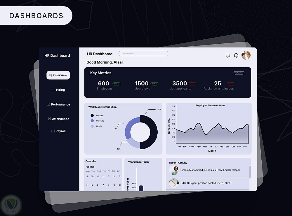 HR Dashboard: يعرض إحصائيات الموظفين، الحضور، الأداء مع رسوم بيانية تسهّل متابعة المؤشرات الرئيسية.