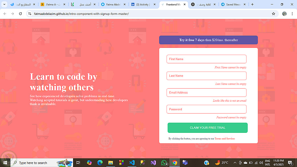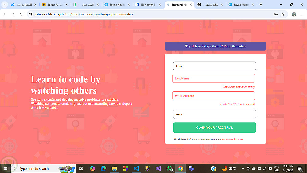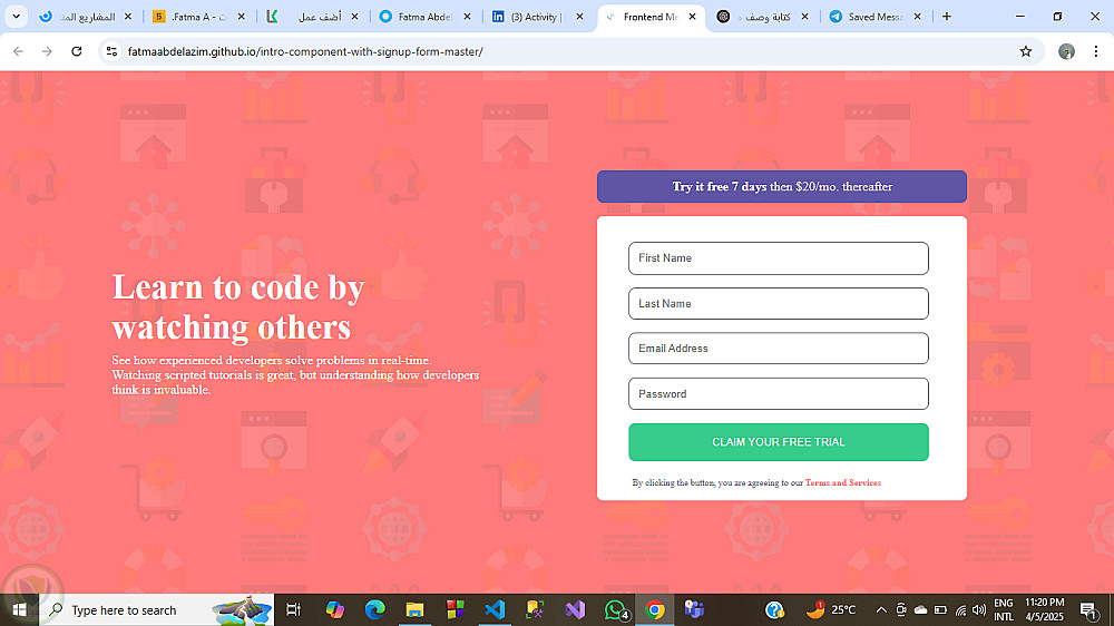 هذه فقرة تعريفية متجاوبة تحتوي على نموذج تسجيل فعّال. يركّز التصميم على تفاعل المستخدم بشكل واضح وتنسيق نظيف. قمت بتنفيذ سلوك متجاوب ليناسب مختلف الأجهزة، وقمت بتنسيق النموذج بعناية. يتضمن النموذج تغذية راجعة للتحقق الأساسي لتوجيه تجربة المستخدم والحفاظ على إمكانية الوصول