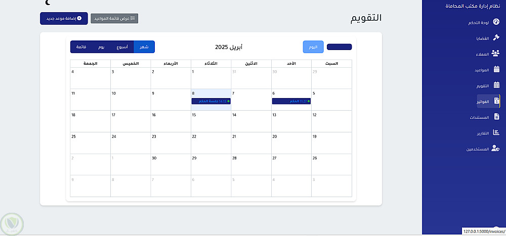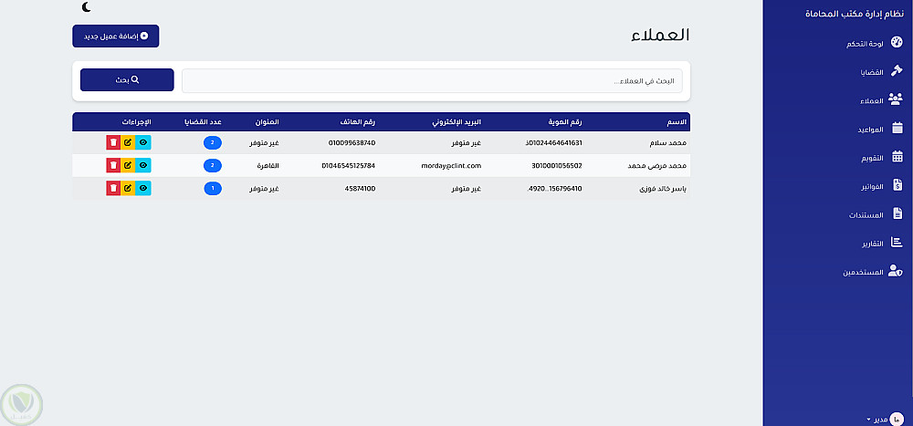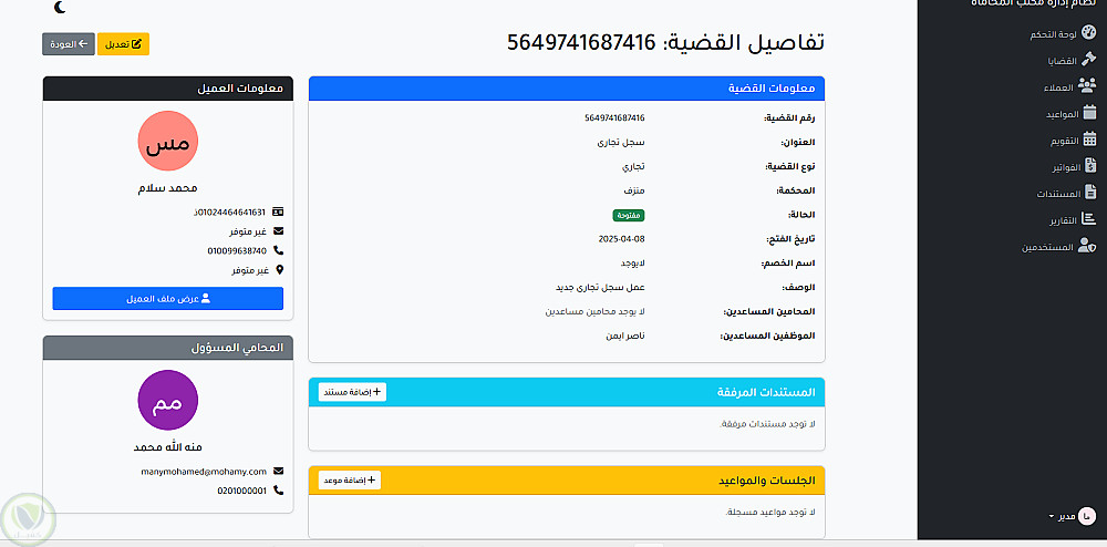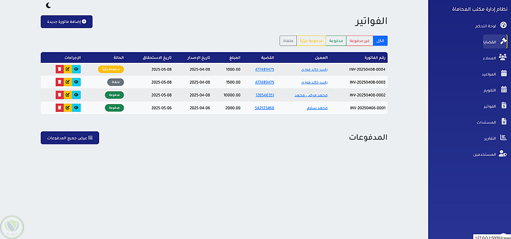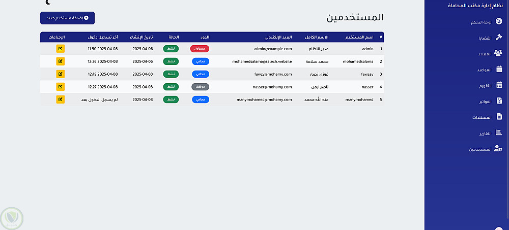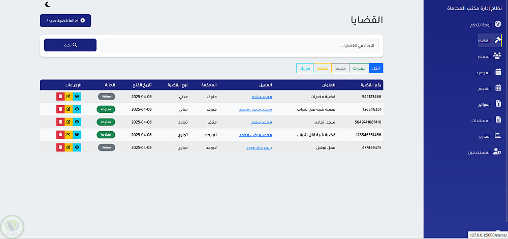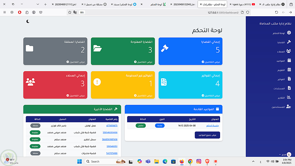 نظام متكامل مصمم باستخدام Python وFlask لتسهيل إدارة العمليات القانونية في المكاتب. يشمل النظام أدوات متقدمة لإدارة المستخدمين، القضايا، العملاء، المستندات، المواعيد، والفواتير. يتميز بواجهة عربية سهلة الاستخدام، تنظيم الكود باستخدام Blueprint، وقاعدة بيانات SQLite لإدارة البيانات بفعالية. يتيح متابعة حالات القضايا وإصدار الفواتير وإدارة المستندات بكفاءة عالية، مما يعزز الأداء والشفافية في العمل القانوني.