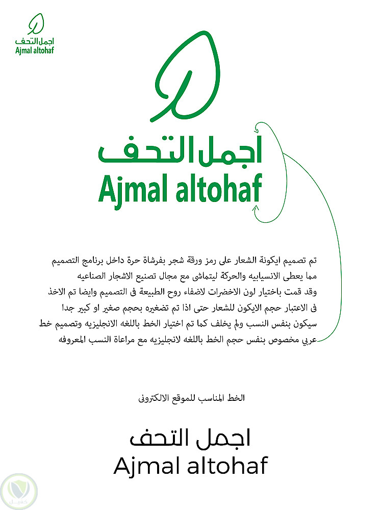 تم تصميم ايكونة الشعار على رمز ورقة شجر بفرشاة حرة داخل برنامج التصميم مما يعطى الانسيابيه والحركة ليتماشى مع مجال تصنيع الاشجار الصناعيه وقد قمت باختيار لون الاخضرات لاضفاء روح الطبيعة فى التصميم وايضا تم الاخذ فى الاعتبار حجم الايكون للشعار حتى اذا تم تضغيره بحجم صغير او كبير جدا سيكون بنفس النسب ولم يخلف كما تم اختيار الخط باللغه الانجليزيه وتصميم خط عربي مخصوص بنفس حجم الخط باللغه لانجليزيه مع مراعاة النسب المعروفه