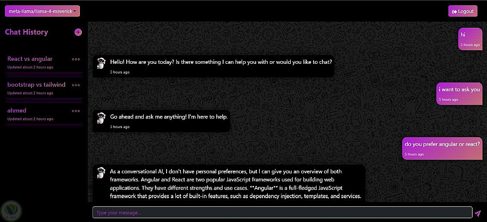 قمت بتطوير تطبيق دردشة ذكي يعتمد على الذكاء الاصطناعي بشكل كامل باستخدام تقنيات الـ Full-Stack. يتيح هذا التطبيق للمستخدمين إجراء محادثات تفاعلية مع مساعد ذكي في الوقت الفعلي، وذلك بفضل دمجه مع نماذج OpenRouter المتقدمة.